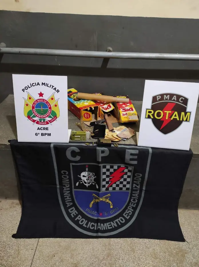 Durante a diligência os militares avistaram várias caixas de fogos jogadas em frente uma residência, após pedir autorização do proprietário para adentrar o imóvel, a guarnição encontrou as munições acima mencionadas.