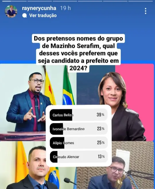 Durante uma enquete realizada no Instagram do digital influencer, Raynery Cunha, com os pretensos pré-candidatos a Prefeitura de Sena Madureira, o nome do Vereador Carlos Beliza foi o mais votado pela população.