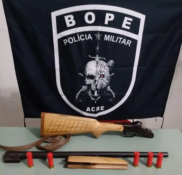 Durante cumprimento da Operação Hórus, do Programa Vigia, uma guarnição do Batalhão de Operações Especiais (BOPE), da Polícia Militar do Acre (PMAC), apreendeu no município de Acrelândia uma arma de fogo tipo “espingarda”, com munições. A Operação foi realizada no início da noite deste sábado, 19, e tinha como principal foco interceptar veículos roubados que seriam levados para a Bolívia.
